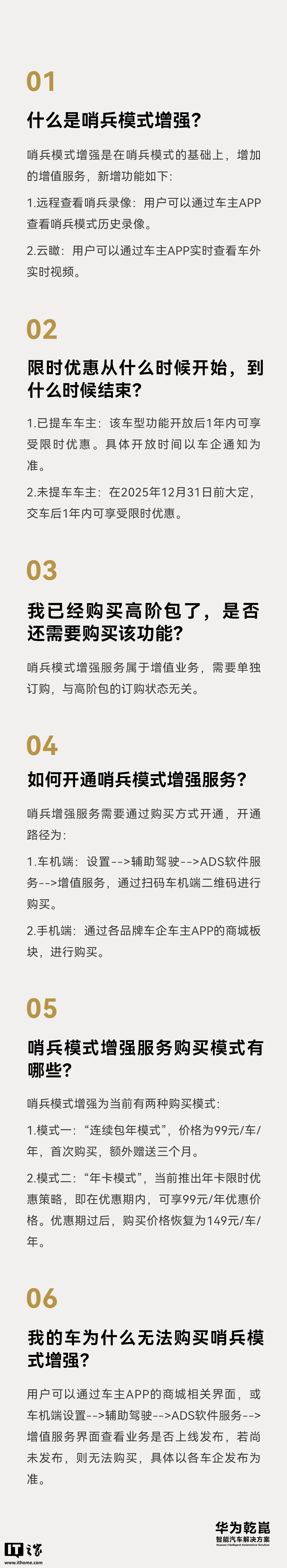 三、注意事项:1、限时优惠开始 / 结束时间:已提车车主:该车型功能开放后 1 年内可享限时优惠。具体开放时间请以车企通知为准。未提车车主:在今年 12 月 31 日前大定,交车后 1 年内可享限时优惠。2、这项功能是否与高阶包重叠?:哨兵模式增强服务属增值业务,需要单独订购,与高阶包的订购状态无关。3、购买教程:车机端:点击“设置”-->辅助驾驶-->ADS 软件服务--> 增值服务,通过扫描车机端二维码进行购买。手机端:通过各品牌车企车主 App 的商城板块进行购买。4、无法购买的原因: